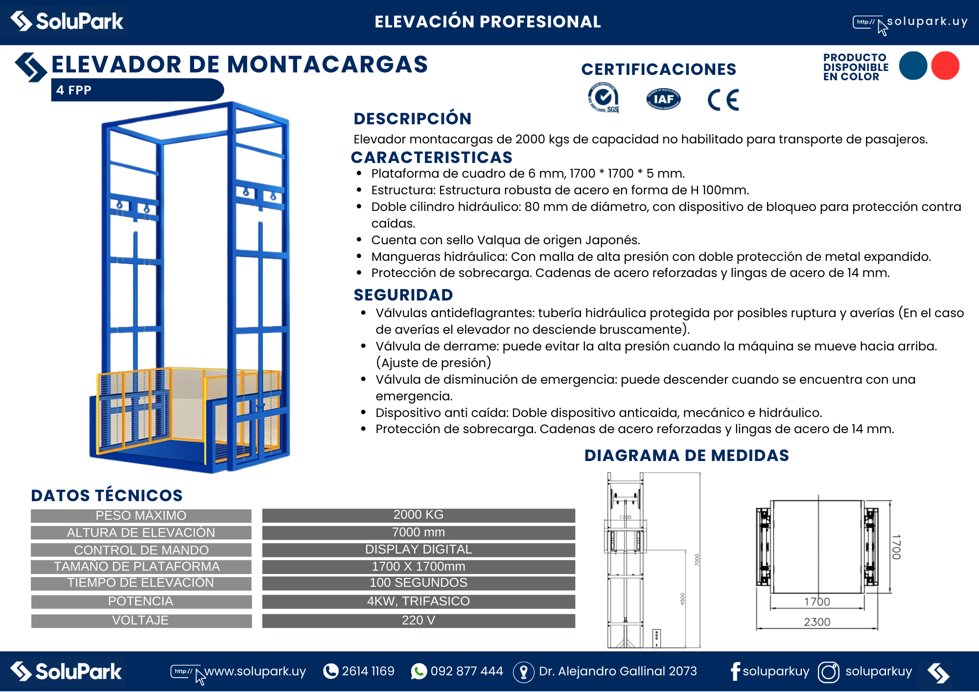 Elevador de monta cargas de 4 columnas 4 FPP Capacidad: 2000 Kg.