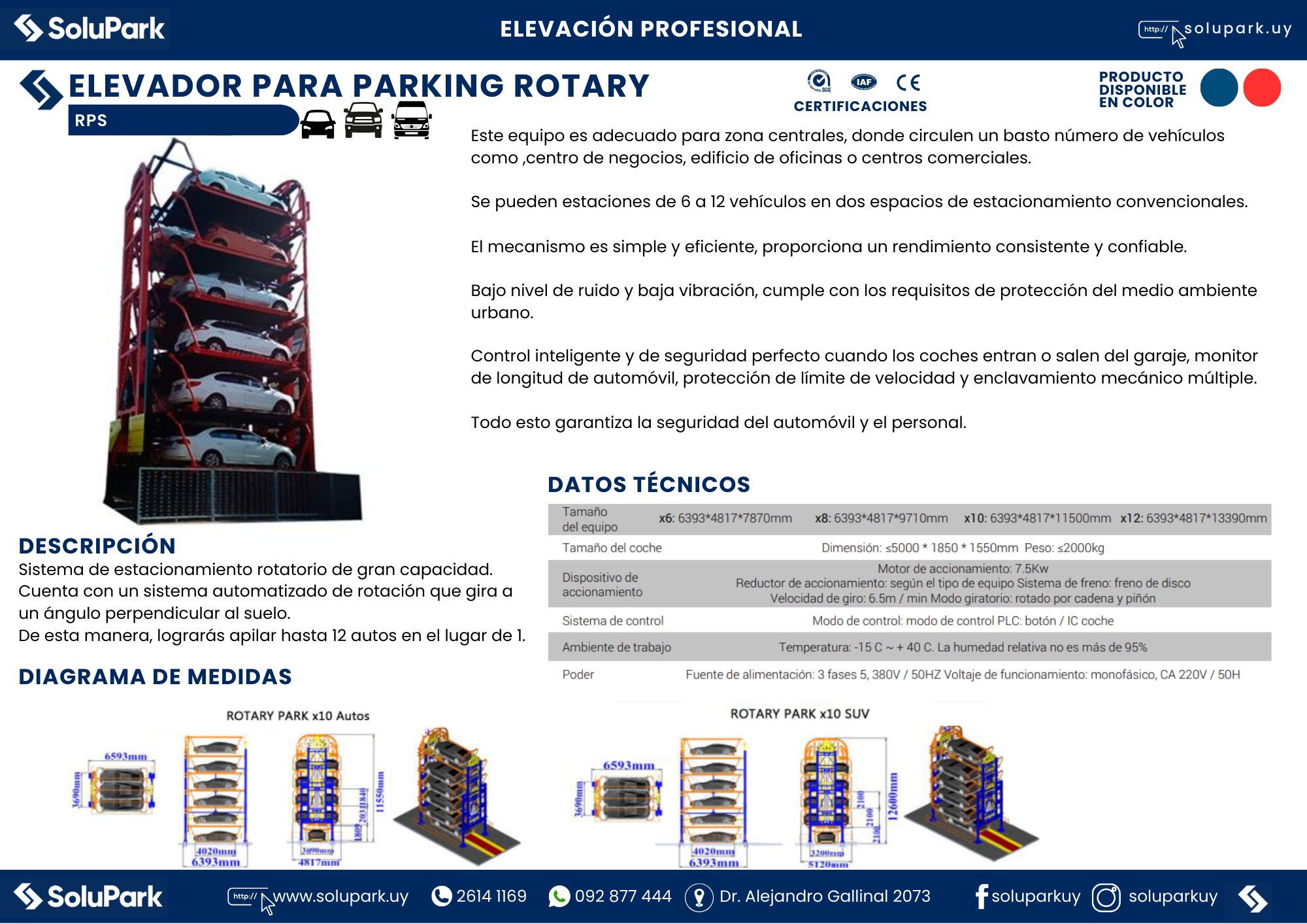 Sistema de estacionamiento rotatorio de gran capacidad. Cuenta con un sistema automatizado de rotación que gira a un ángulo perpendicular al suelo. De esta manera, lograrás apilar hasta 12 autos en el lugar de 1.